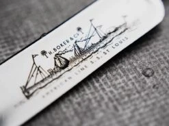 Die 6/8 Zoll breite Klinge dieses außergewöhnlichen Rasiermessers wird extra hohl auf Klang ausgeschliffen und mit einer beidseitigen Serrierung ausgestattet. Der französische Kopf der Rasiermesserklinge aus dem Kohlenstoffstahl O1 fügt sich harmonisch in das außergewöhnliche Heft aus Abalone ein. Die schlichte Lasergravur geht zurück auf eine historische Klingenätzung, die bereits Anfang des 20. Jahrhunderts für besonders ausgefallene Rasiermesser von Böker verwendet wurde. Auslieferung in einem hochwertigen Rahmenetui und mit Echtheitszertifikat.