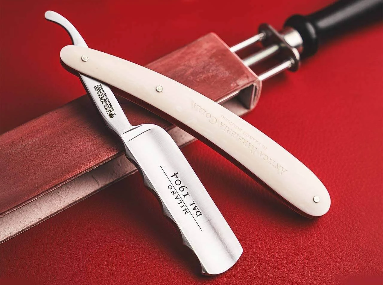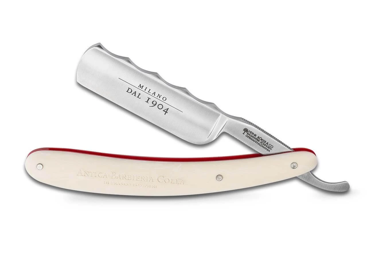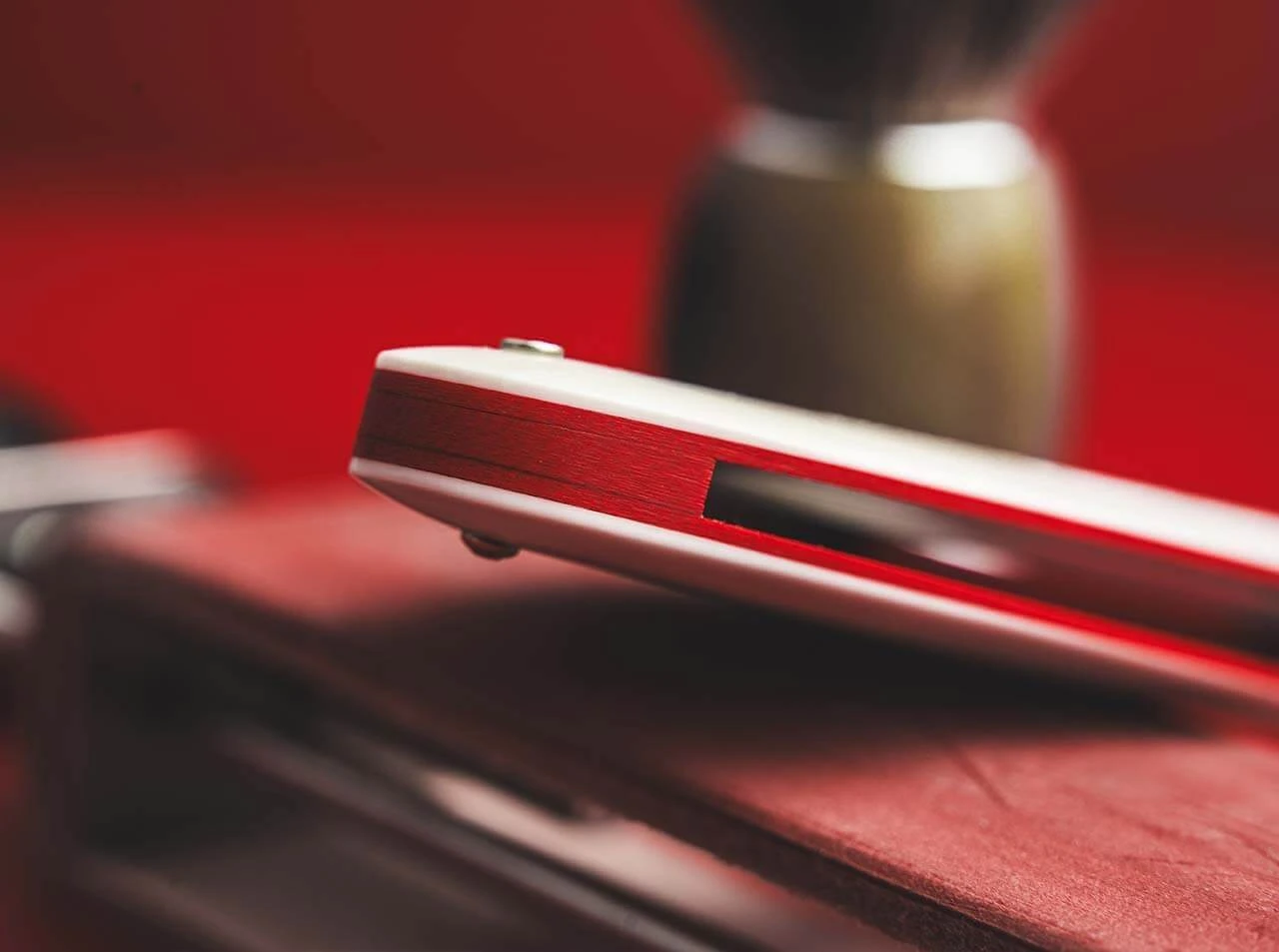 Die elfenbeinfarbenen Elforyn-Griffschalen mit roten G10-Linern greifen den edlen Farbcode der Antica-Barbieria-Colla-Produktline auf.