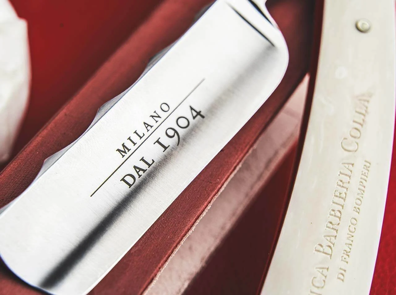 Das Herzstück bildet eine mächtige 7/8 Zoll breite Klinge aus traditionellem bestem Silberstahl mit ebenso traditionellem Rundkopf. Der Rücken wird von unseren Schleifern mit weit geschwungenen Zierkullen versehen, die den ornamentalen Rahmen auf den Barbieria-Colla-Grooming-Produkten aufgreifen. Für die sicherer Handhabung mit seifigen Händen wird die Angel mit einer aufwändigen Serrierung ausgestattet.
