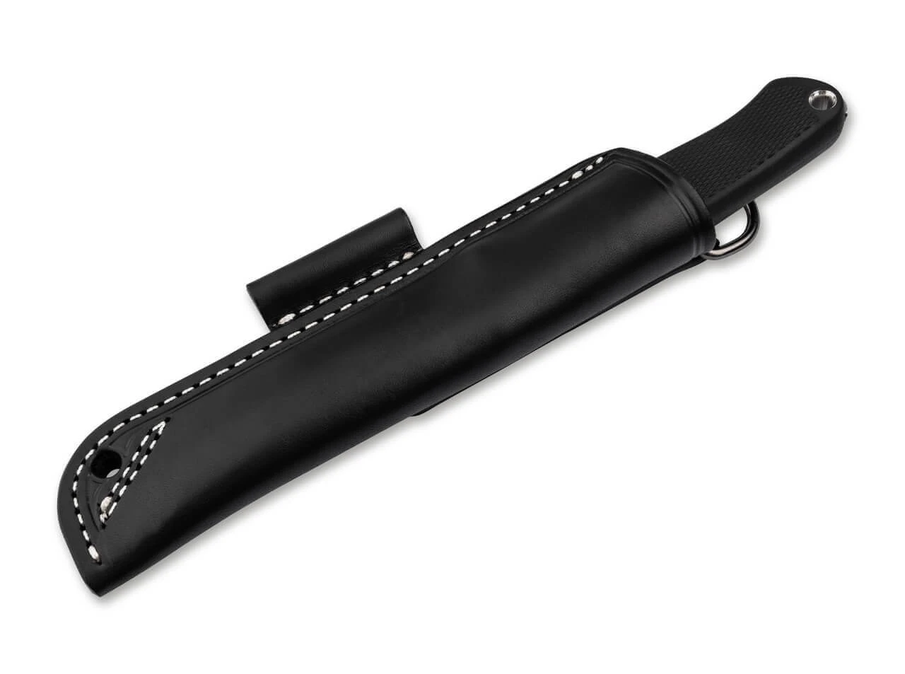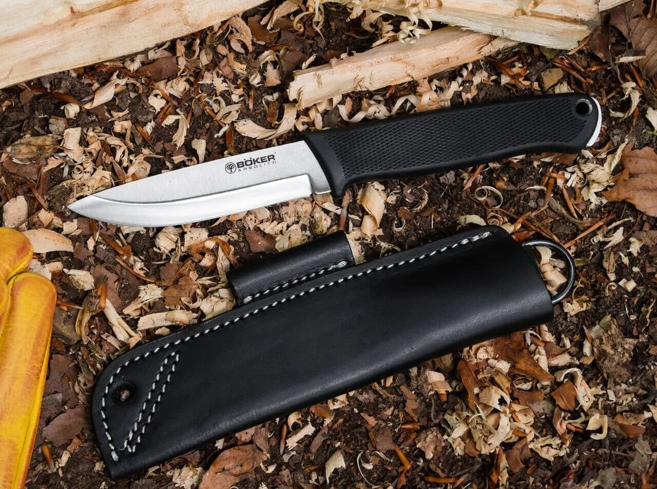 Arbolito BK1 Das Böker Arbolito BK-1 (Bushcraft Knife Nr. 1) stellt ein Heavy Duty Bushcraft-Messer im Stile moderner Piloten-Überlebensmesser par excellence dar. Die breite Droppoint-Klinge hat mit 10,3 cm eine optimale Länge und einen mittelhohen Anschliff für maximale Stabilität. Diese Stabilität wird weiterhin durch die kompromisslose Wahl des Böhler-Stahls N690 gewährleistet. Der Erl ist durchgängig und ragt einige Millimeter aus dem Griffende. Das sorgt für ein Maximum an Stabilität. Als Griffmaterial wurde TPE – thermoplastisches Elastomer – gewählt. Das Material umschließt den Erl vollständig und ist mit einem klassischen Checkering für optimale Griffigkeit versehen. TPE ist widerstandsfähig, elastisch, rutschfest und hat eine geringe Wärmeleitfähigkeit. Das Messer liegt also bei allen Witterungs- und Arbeitsbedingungen sicher in der Hand und zieht bei Nässe und Kälte die Kraft nicht aus den Fingern. Die eingelassene Fangriemenöse ist zusätzlich mit einer Edelstahlhülse gefasst. Zur Ausstattung gehört eine Köcherlederscheide – die Königsdisziplin im Scheidenbau – mit tiefem und festem Sitz des Messers. Das Messer ist beim Führen somit sowohl vor Verlust als auch vor Beschädigung bestmöglich geschützt, ohne eine beschädigungsanfällige Sicherung zu erfordern, die den schnellen Zugriff erschwert. Ein abnehmbarer Dangler ermöglicht wahlweise entweder eine hohe Trageposition am Gürtel oder eine tiefe unter dem Hüftgurt des Tourenrucksacks. Zusätzlich ist die Scheide mit einer breiten, fest in die Keder integrierten, Lederschlaufe ausgestattet, die Platz für die Aufnahme eines Feuerstarters / Metal Match (9,3 mm) bietet (nicht im Lieferumfang enthalten).