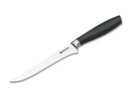 Böker Core Professional AusbeinmesserWas haben Trier, Wiesbaden, Münster und Lüneburg gemeinsam? Neben historischen Stadtkernen, überregionalen Sehenswürdigkeiten und einer langen Tradition als bedeutende Handelsstädte vor allem eines: Sie beherbergen exzellent geführte Stahlwarenhändler, die sich durch ein breites Warenangebot und eine hohe Fach- und Beratungskompetenz seit vielen Jahren einen Namen gemacht haben. Die jahrzehntelange Erfahrung, das ausgezeichnete Know-How und das tagtäglich im Geschäftsalltag bewiesene Gespür für die Anforderungen und Bedürfnisse von koch- und küchenbegeisterten Kunden haben wir uns zunutze gemacht und gemeinsam mit unserer fast 150-jährige Erfahrung als Solinger Messermanufaktur in die Produktentwicklung der Böker Core Professional Serie fließen zu lassen. Entstanden ist ein Produkt, welches sich aufgrund der dynamischen Linienführung, dem hervorragenden Handling und der atemberaubenden Schneidfähigkeiten das Prädikat „Empfohlen von führenden Fachhändlern“ mehr als verdient hat. Der massive Klingenrohling aus der für hochwertige Küchenmesser exzellent geeigneten Chrom-Molybdän-Vanadium- Legierung (X50CrMoV15) wird durch die aufwändige Schmiedung in Solinger Handarbeit zusätzlich im Gefüge optimiert und anschließend auf 58 HRC gehärtet. Für eine längere Standzeit der Klinge und ein noch feineres Schnittbild wird der bei uns übliche traditionelle Handabzug zusätzlich hochglanzpoliert. Der geschmiedete Kropf bietet jederzeit einen sicheren Griff und schützt bei einem Abrutschen vor möglichen Verletzungen. Als besonderes Design-Feature ist der Klingenrücken bei allen Messern dieser Serie sanft abgerundet. So liegt das Messer in jeder Griffposition angenehm in der Hand und verhindert auch bei stärkerem Druck auf den Klingenrücken im Wiegeschnitt ein unangenehmes Druckgefühl in der Hand. Die praktischen und perfekt proportionierten Griffe aus Kunststoff vervollständigen das stimmige Gesamtbild. So sind die Messer im höchsten Maße feuchtigkeitsresistent und können auch in der professionellen Gastronomie bedenkenlos eingesetzt werden. Denn gerade in der Küche hat die Hygiene jederzeit höchste Ansprüche zu erfüllen.Technische DatenGesamtlänge: 29,5 cmKlingenlänge: 16,5 cmKlingenmaterial: X50CrMoV15Griffmaterial: KunststoffVerschluss: Feststehend