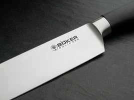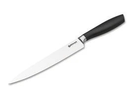 Böker Core Professional SchinkenmesserWas haben Trier, Wiesbaden, Münster und Lüneburg gemeinsam? Neben historischen Stadtkernen, überregionalen Sehenswürdigkeiten und einer langen Tradition als bedeutende Handelsstädte vor allem eines: Sie beherbergen exzellent geführte Stahlwarenhändler, die sich durch ein breites Warenangebot und eine hohe Fach- und Beratungskompetenz seit vielen Jahren einen Namen gemacht haben. Die jahrzehntelange Erfahrung, das ausgezeichnete Know-How und das tagtäglich im Geschäftsalltag bewiesene Gespür für die Anforderungen und Bedürfnisse von koch- und küchenbegeisterten Kunden haben wir uns zunutze gemacht und gemeinsam mit unserer fast 150-jährige Erfahrung als Solinger Messermanufaktur in die Produktentwicklung der Böker Core Professional Serie fließen zu lassen. Entstanden ist ein Produkt, welches sich aufgrund der dynamischen Linienführung, dem hervorragenden Handling und der atemberaubenden Schneidfähigkeiten das Prädikat „Empfohlen von führenden Fachhändlern“ mehr als verdient hat. Der massive Klingenrohling aus der für hochwertige Küchenmesser exzellent geeigneten Chrom-Molybdän-Vanadium- Legierung (X50CrMoV15) wird durch die aufwändige Schmiedung in Solinger Handarbeit zusätzlich im Gefüge optimiert und anschließend auf 58 HRC gehärtet. Für eine längere Standzeit der Klinge und ein noch feineres Schnittbild wird der bei uns übliche traditionelle Handabzug zusätzlich hochglanzpoliert. Der geschmiedete Kropf bietet jederzeit einen sicheren Griff und schützt bei einem Abrutschen vor möglichen Verletzungen. Als besonderes Design-Feature ist der Klingenrücken bei allen Messern dieser Serie sanft abgerundet. So liegt das Messer in jeder Griffposition angenehm in der Hand und verhindert auch bei stärkerem Druck auf den Klingenrücken im Wiegeschnitt ein unangenehmes Druckgefühl in der Hand. Die praktischen und perfekt proportionierten Griffe aus Kunststoff vervollständigen das stimmige Gesamtbild. So sind die Messer im höchsten Maße feuchtigkeitsresistent und können auch in der professionellen Gastronomie bedenkenlos eingesetzt werden. Denn gerade in der Küche hat die Hygiene jederzeit höchste Ansprüche zu erfüllen. Das Schinkenmesser ist mit seiner langen und schlanken Form bestens zum präzisen Schneiden von Fleisch und Fisch geeignet. Hauchfeine Scheiben lassen sich damit genauso einfach schneiden wie Würfel oder gleichmäßig starke Tranchen. Das Schinkenmesser ist etwas flexibler als andere Messer und gleitet optimal durch das Fleisch.Technische DatenGesamtlänge: 33,5 cmKlingenlänge: 21 cmKlingenstärke: 2,3 mmGewicht: 128 GrammKlingenmaterial: X50CrMoV15Griffmaterial: KunststoffVerschluss: Feststehend