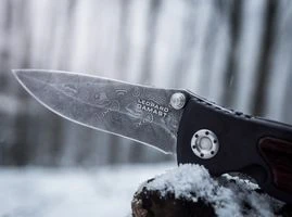 Ein Leistungs-Damaststahl (300 Lagen), geschmiedet aus dem Kanonenrohr des Kampfpanzers Leopard I. Der Damastschmied hat ihn uns vorgestellt: "Durch einen Zufall bin ich an Kanonenrohre des Panzers Leopard I gekommen. Dieser Stahl ist im Handel nicht zu beziehen und eine Werkstoffnummer gibt es für dieses Material ebenfalls nicht, da es für militärische Zwecke Verwendung findet. Das hat mich gereizt und ich probierte diesen Stahl direkt für meine Damastproduktion aus. Den enorm verschleißfesten Kanonenrohrstahl habe ich mit einem Chrom- Mangan- und Vanadiumlegierten Werkzeugstahl mit hohem Kohlenstoffgehalt kombiniert. Die Qualität des Ergebnisses ist sehr beeindruckend. Die Klingen hatten eine für Damaststahl enorm hohe Härte (65° HRC) und zugleich ein hohes Maß an Zähigkeit. Ein Leistungsdamast!" Als Prägemuster haben wir zusammen mit dem Böker-Damastschmied die "Kleinen Pyramiden" ausgewählt, die auf den Damastklingen sehr schön zum Vorschein kommen. Diesen weltweit einzigartigen Damaststahl gibt es exklusiv nur bei Böker. Die Leopard-Damast-Klinge passt ideal zu unserem neuen Modell HELIOS, mit Hardcoat-eloxierter 6061-T6 Aluminium-Schale, natürlich olivfarben mit Einlagen aus Zirikoteholz. Ausgeliefert wird das Messer in einer ansprechenden Sammlerschatulle mit heitszertifikat. Gesamtlänge 21 cm. Klinge 9 cm. Gewicht 120 g.