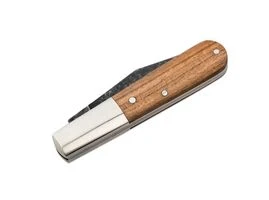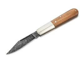Böker Manufaktur Solingen Barlow Pflaume O1Das klassische Barlow erhält in dieser besonderen Ausführung eine Klinge aus O1 Kohlenstoffstahl mit rustikalem Stonewash-Finish sowie eine charakterstarke Griffbeschalung aus Pflaumenholz, eingefasst von polierten Neusilberbacken. Mit seiner typischen, überlangen Backe und der breiteren Klinge ist das Slipjoint- Messer einerseits ein kleiner, absolut hosentaschentauglicher Begleiter, andererseits aber auch groß genug, um die meisten Schneidarbeiten des Alltages problemlos zu bewältigen. Handgefertigt in der Böker Manufaktur in Solingen.Technische DatenGesamtlänge: 15 cmKlingenlänge: 6,5 cmKlingenstärke: 2 mmGewicht: 58 GrammKlingenmaterial: O1Griffmaterial: PflaumenholzVerschluss: SlipjointÖffnungshilfe: NagelhauÖffnungsmechanismus: ManuellFarbe: BraunKlingenfarbe: Unbeschichtet