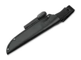 Böker Manufaktur Solingen BroncoBei der Konzeption unseres neuen feststehenden Outdoor-Messers Böker BRONCO haben wir uns ehrgeizige Ziele gesetzt. Es sollte auf dem letzten Stand der technischen Möglichkeiten sein und optimale Funktionalität im Hinblick auf moderne Bedürfnisse bieten. Zu diesem Zweck sollte es folgende Eigenschaften aufweisen: -Universelle und optimale Einsatzfähigkeit für sämtliche professionellen Outdoor-Anwender wie: Bushcrafter, Campcrafter, Survivalisten, Streckenwanderer, Jäger, SAR-Teams und andere – Eine Klinge aus CPM-Stahl auf dem höchsten Stand der metallurgischen Möglichkeiten – Ein Griff, der auch bei langem Arbeiten angenehm in der Hand liegt, die durchgängige Angel vollständig umschließt und bei Kälte keine Wärme aus der Hand ableitet – Ein hochwertige Lederscheide, die mit und ohne Dangler getragen werden kann, das Messer vor Verlust und Beschädigung schützt, über eine Aufnahme für einen Feuerstahl verfügt und mit einem solchen ausgestattet ist – 100% Fertigung am Standort Solingen/Germany – Ein moderater Preis im Hinblick auf die Ausstattung Diese ambitionierten Anforderungen konnten wir in der folgenden Weise umsetzen: Der CPM-3V wurde von Crucible Industries LLC – dem Spezialisten und weltweiten Marktführer für pulvermetallurgische Stähle – entwickelt, um bei einer sagenhaften Schnitthaltigkeit und Härte von 62-63 HRC eine bisher ungekannte Schocklastverträglichkeit, Bruchelastizität und Splittersicherheit zu gewährleisten. Diese Eigenschaften des pulvermetallurgischen Kohlenstoffstahles wurden unter anderem durch einen genau abgestimmten Chromgehalt von 7,5% erreicht. Auf diese Weise konnten die positiven Eigenschaften des Legierungselementes Cr wie die Steigerung der Verschleißfestigkeit und Härtbarkeit genutzt und gleichzeitig ein feines Gefüge erhalten werden. Die universale breite Droppoint-Klinge mit hoch angesetztem Saber-Grind ist seit jeher die bevorzugte Form des Jägers für Hoch- und Niederwild und eignet sich außerdem sowohl für feine Aufgaben wie das Stöckefedern als auch fürs Grobe wie das obligatorische Batoning. Der Erl ist durchgängig und ragt einige Millimeter aus dem Griffende. Das sorgt für das Maximum an Stabilität und die Angel verträgt auch kräftige Schläge mit einem Rundholz oder anderem Gegenstand. Ein kurzer Teil des Klingenrückens bildet beidseitig scharfe 90°-Kanten zum Funken schlagen aus dem mitgelieferten Feuerstarter. Als Griffmaterial wurde TPE – thermoplastisches Elastomer – gewählt, das den Erl vollständig umschließt und mit einer in jede Belastungsrichtung griffigen Struktur versehen ist. TPE ist widerstandsfähig, elastisch, rutschfest und hat eine geringe Wärmeleitfähigkeit. Das Messer liegt also bei allen Witterungs- und Arbeitsbedingungen sicher in der Hand und zieht bei Nässe und Kälte die Kraft nicht aus den Fingern. Gegenüber gewöhnlichen Elastomeren hat TPE zudem den Vorzug die Umwelt in der Fertigung zu entlasten, da diese rein physikalisch erfolgt und die langwierige und energieaufwändige Vulkanisierung chemisch vernetzter Elastomere entfällt. Zur Ausstattung gehört eine Köcherlederscheide – die Königsdisziplin im Scheidenbau – mit tiefem und festem Sitz des Messers. Das Messer ist beim Führen somit sowohl vor Verlust als auch vor Beschädigung bestmöglich geschützt, ohne eine beschädigungsanfällige Sicherung zu erfordern, die den schnellen Zugriff erschwert. Ein abnehmbarer Dangler ermöglicht wahlweise entweder eine hohe Trageposition am Gürtel oder eine Tiefe unter dem Hüftgurt des Tourenrucksacks. Zusätzlich ist das Messer mit einem 9,3 mm Feuerstarter / Metalmatch des Marktführers Light My Fire ausgestattet, der in einer breiten, fest in die Keder integrierten, eng sitzenden Lederschlaufe Platz findet. Somit wird das Böker BRONCO zum kompakten, vielseitigen und vollständigen Wildnis- und Überlebenswerkzeug, das jeder Situation gewachsen ist. Technische DatenGesamtlänge: 23 cmKlingenlänge: 11,3 cmKlingenstärke: 3,4 mmGewicht: 147 GrammKlingenmaterial: CPM-3VGriffmaterial: TPEVerschluss: FeststehendFarbe: SchwarzKlingenfarbe: Unbeschichtet