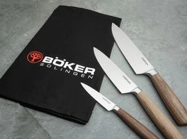 Böker Manufaktur Solingen Core Messertrio mit GeschirrtuchWas haben Trier, Wiesbaden, Münster und Lüneburg gemeinsam? Neben historischen Stadtkernen, überregionalen Sehenswürdigkeiten und einer langen Tradition als bedeutende Handelsstädte vor allem eines: Sie beherbergen exzellent geführte Stahlwarenhändler, die sich durch ein breites Warenangebot und eine hohe Fach- und Beratungskompetenz seit vielen Jahren einen Namen gemacht haben. Die jahrzehntelange Erfahrung, das ausgezeichnete Know-How und das tagtäglich im Geschäftsalltag bewiesene Gespür für die Anforderungen und Bedürfnisse von koch- und küchenbegeisterten Kunden haben wir uns zunutze gemacht und gemeinsam mit unserer fast 150-jährige Erfahrung als Solinger Messermanufaktur in die Produktentwicklung der Böker Core Serie fließen zu lassen. Entstanden ist ein Produkt, welches sich aufgrund der dynamischen Linienführung, dem hervorragenden Handling und der atemberaubenden Schneidfähigkeiten das Prädikat „Empfohlen von führenden Fachhändlern“ mehr als verdient hat. Der massive Klingenrohling aus der für hochwertige Küchenmesser exzellent geeigneten Chrom-Molybdän-Vanadium- Legierung (X50CrMoV15) wird durch die aufwändige Schmiedung in Solinger Handarbeit zusätzlich im Gefüge optimiert und anschließend auf 58 HRC gehärtet. Für eine längere Standzeit der Klinge und ein noch feineres Schnittbild wird der bei uns übliche traditionelle Handabzug zusätzlich hochglanzpoliert. Der geschmiedete Kropf bietet jederzeit einen sicheren Griff und schützt bei einem Abrutschen vor möglichen Verletzungen. Als besonderes Design-Feature ist der Klingenrücken bei allen Messern dieser Serie sanft abgerundet. So liegt das Messer in jeder Griffposition angenehm in der Hand und verhindert auch bei stärkerem Druck auf den Klingenrücken im Wiegeschnitt ein unangenehmes Druckgefühl in der Hand. Die wunderschön gemaserten und perfekt proportionierten Griffe aus Walnussholz vervollständigen das stimmige Gesamtbild. Als idealen Einstieg für den ambitionierten Hobbykoch haben wir unser Programm durch das dreiteilige Messerset erweitert. Das Set kommt in einer hochwertigen Geschenkverpackung und besteht aus einem großen Kochmesser, einem kleinen Kochmesser, einem Spickmesser und einem Geschirrtuch.Technische DatenKlingenmaterial: X50CrMoV15Griffmaterial: WalnussholzFarbe: BraunKlingenfarbe: Unbeschichtet