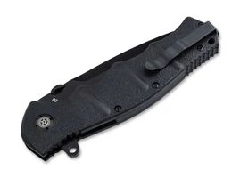 Böker Plus AK101 2.0Das Böker Plus AK-101 2.0 aus der Kalashnikov-Serie ist ein ausgewachsenes Heavy Duty-Messer, das sowohl für den taktischen Einsatz als auch zur Outdoor-Anwendung geeignet ist. Der Griff aus hochfestem Kunststoff liegt dank der strukturierten Oberfläche, den typischen Querstegen sowie der Fingerrillen sicher in der Hand. Die Riffelungen im Bereich der Daumenauflage garantieren zudem kontrolliertes Schneiden. In der Version 2.0 wartet das Taschenmesser mit einer schwarz beschichteten Droppoint-Klinge aus D2 auf, die selbst mit Handschuhen per Flipper oder beidseitig erreichbarem Daumenheber problemlos geöffnet werden kann. Der Glasbrecher am Griffende erweitert das Anwendungsspektrum noch einmal erheblich. Die unter der Griffschale gelagerten Stahl-Liner verleihen der gesamten Konstruktion die nötige Stabilität. Verriegelt wird das Taschenmesser durch den zuverlässigen Liner Lock-Verschluss. Mit Fangriemenöse und Clip (Tip-up/r).Technische DatenGesamtlänge: 25 cmKlingenlänge: 10,3 cmKlingenstärke: 3,5 mmGewicht: 202 GrammKlingenmaterial: D2Griffmaterial: KunststoffVerschluss: LinerlockÖffnungshilfe: DaumenöffnungÖffnungsmechanismus: ManuellFarbe: SchwarzKlingenfarbe: Schwarz
