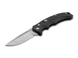 Böker Plus Intention II BlackDas als taktisches Automatikmesser konzipierte Böker Plus Intention überzeugt nicht nur im Einsatz, sondern bewältigt auch alle anfallenden Schneidaufgaben des Alltags mühelos. Das Betätigen des Druckknopfes gibt die Stonewash-Klinge aus D2 frei, durch die Spannung der dahinterliegenden Feder klappt sie dann selbstständig auf. Eine sauber rastende Schiebesicherung gegen versehentliches Auslösen sichert das Messer zusätzlich. Der ergonomisch geformte Griff wird aus strukturiertem G10 gefertigt, Riffelungen im Bereich der Daumenauflage und die ausgeprägte Fingermulde verbessern die Handlage nochmals. Mit Fangriemenöse und Clip (Tip-down). Technische DatenGesamtlänge: 20 cmKlingenlänge: 8 cmKlingenstärke: 2,79 mmGewicht: 109 Gramm183Klingenmaterial: D2Griffmaterial: G10Verschluss: DruckknopfÖffnungshilfe: DruckknopfÖffnungsmechanismus: AutomatikKlingenfarbe: UnbeschichtetLumen: Öffnungshilfe: DruckknopfÖffnungsmechanismus: AutomatikKlingenfarbe: Unbeschichtet