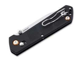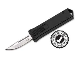 Böker Plus SlikeDas innovative Böker Plus Slike ist ein leichtgewichtiger Dolch mit beidseitig geschliffener Klinge aus D2, die frontal aus dem Griff geschoben wird. Vergleichbar mit dem Mechanismus der weit verbreiteten Teppichmesser wird die Verriegelung dafür per Knopfdruck gelöst und die satinierte Klinge dann manuell nach oben oder unten bewegt. Eine Rastung auf halber Strecke erhöht die Arbeitssicherheit zusätzlich. Sie ist mit einem modernen Flachschliff und einer ausgeprägten Hohlkehle versehen. Die CNC-gefräste Griffschale aus schwarzem G10 liegt trotz der geringen Größe des Taschenmessers angenehm in der Hand. Mit Fangriemenöse, großzügig dimensioniertem Deep-Carry-Clip (Tip-down) und hochwertigem Nylon-Etui zur Aufbewahrung. Leider kam es bei diesem Artikel im aktuellen Katalog zu einem Druckfehler, gültig sind die hier angezeigten Maße. Wir bitten den Druckfehler im Katalog zu entschuldigen und danken für Ihr Verständnis.Technische DatenGesamtlänge: 17,75 cmKlingenlänge: 7,6 cmKlingenstärke: 2,5 mmGewicht: 35,9 GrammKlingenmaterial: D2Griffmaterial: G10Verschluss: DruckknopfÖffnungshilfe: DaumenpinÖffnungsmechanismus: ManuellFarbe: SchwarzKlingenfarbe: Unbeschichtet