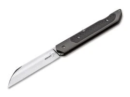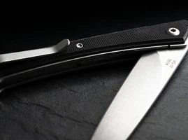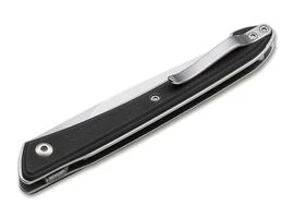 Das nahezu filigrane Böker Plus Spillo gehört sicherlich zu den kompaktesten Gentlemanmessern in unserem Sortiment und erinnert leicht an ein modernes Steakmesser. Es ist mit einer flachgeschliffenen Klinge aus VG-10 ausgestattet, die per Flipper geöffnet wird. Und obwohl dieser nur minimal aus dem überaus schmalen Griff herausragt, kann die kugelgelagerte Klinge mit etwas Druck schnell und komfortabel geöffnet werden. Der schwarze Griff aus texturiertem G10 beherbergt den stabilen Linerlock. Mit demontierbarem Clip (Tip-up).