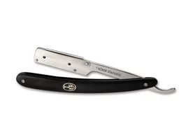 Neben den bereits etablierten Böker Barberetten mit Klingenaufnahme aus Kunststoff, bieten wir auf vielfachen Wunsch von Barbieren auch ein Rasierklingenmesser mit Klingenaufnahme aus rostfreiem Edelstahl. Die Klingenaufnahme der Böker Pro Barberetten ist so konzipiert, dass eine halbierte Double Edge (43 mm Standardklinge) sicher zwischen den beiden Edelstahlhälften mit entsprechenden Haltepunkten fixiert wird. Dieses System hat sich bereits seit vielen Jahren bei professionellen Friseuren und Barbieren etabliert und wurde von uns weiter optimiert. Die Böker Pro Barberette folgt in Geometrie und Größe exakt den hochwertigen geschmiedeten Rasiermessern aus der Böker Manufaktur Solingen. Die Unterseite des Erls ist mit einer feinen Serrierung ausgestattet und ermöglicht somit auch im feuchten Zustand jederzeit einen sicheren Halt. Zur verbesserten Öffnung der beiden Klingenhälften ist der Rundkopf mit einer beidseitigen, nach innen gerichteten Phase versehen. Im Anschluss an die Entfernung des Spannbügels lassen sich die beiden Hälften schnell und einfach durch einen Griff an den Rundkopf gegeneinander verschieben. Die saubere Vernietung und Verarbeitung garantierten präzises Arbeiten und eine lange Lebensdauer auch bei intensiver Beanspruchung. Die Böker Pro Barberette verbindet professionelle Praxistauglichkeit mit der gewohnten Handhabung und Balance sowie der authentischen Ästhetik eines klassischen Rasiermessers. Zudem bietet es für den Anfänger eine preisliche Alternative zum geschmiedeten Rasiermesser. Vor dem Einsetzen werden die Doppelrasierklingen vorsichtig in der Mitte durchgebrochen. Die Auslieferung erfolgt in historischer Verpackung mit einer Double Edge- Klinge. Mit Heft aus feuchtigkeitsresistentem Kunststoff mit Intarsie. Das pflegeleichte Material ist sehr robust und überzeugt durch seine klassische Anmutung.