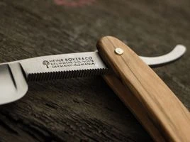 Böker Manufaktur Solingen The Celebrated OliveWiederauflage der berühmtesten Modelle in der langen Geschichte der Böker Rasiermesser. Bereits im Produktkatalog von Boker USA aus dem Jahr 1906 wurden besonders hochwertige Modelle mit diesem traditionsreichen Schriftzug ausgezeichnet. Auch bei den neu konzipierten Modellen mit Heften aus Edelhölzern werden die beliebten 5/8 Zoll breiten Klingen aus Kohlenstoffstahl aufwendig gefertigt und verziert. Inklusive Echtheitszertifikat und historischer Verpackung. Die Beschalung aus handverlesenem Olivenholz verleiht dem The Celebrated Olive seinen besonderen Akzent und begeistert mit einer lebhaften Maserung. Veredelt ist dieses Modell mit dem klassischen Böker-Baumsymbol, welches filigran in das Holzheft eingearbeitet wird. Der Klingenrücken ist zusätzlich mit feinen Ziselierungen kunstvoll verziert. Technische DatenKlingenmaterial: KohlenstoffstahlGriffmaterial: Olivenholz