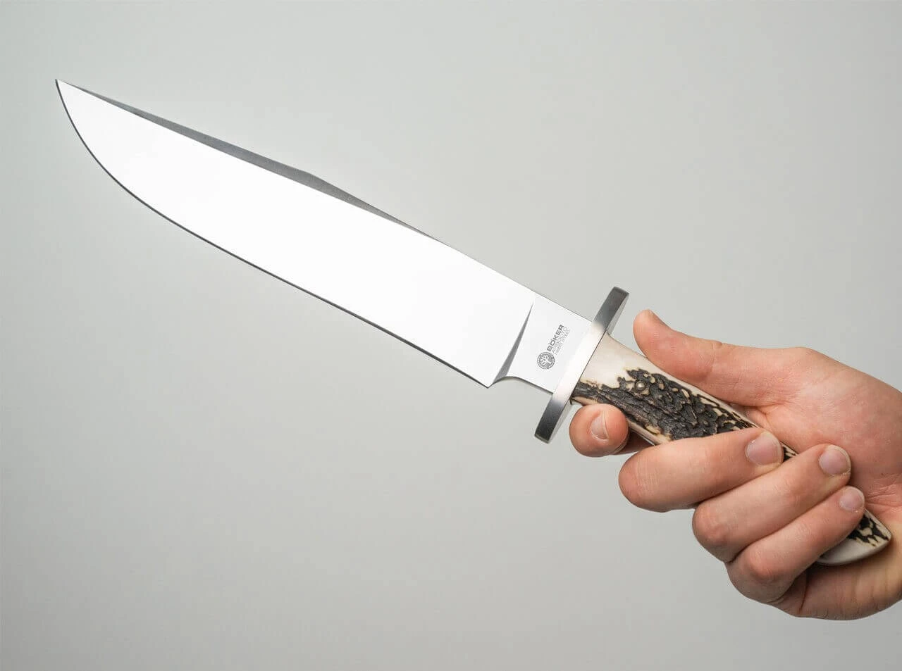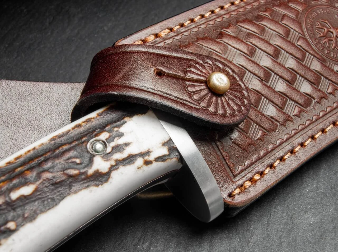 Eine Lücke im Sortiment schließen wir mit dem El Gigante mit Hirschhornbeschalung. Das überaus robuste Bowiemesser in Fulltang-Bauweise hat schon viele Outdoor-Enthusiasten und Jäger begeistert. Mit der Beschalung aus ausgesuchtem Hirschhorn ist es nun perfekt ausgestattet für den jagdlichen Einsatz und überzeugt als Standhauer ebenso wie als effektives Abfangmesser für Schwarzwild oder den kapitaleren Hirsch. Die Klinge des Hirschfängers wird aus N695 gefertigt, das Parierelement besteht aus Edelstahl. Lieferung mit hochwertiger Lederscheide.