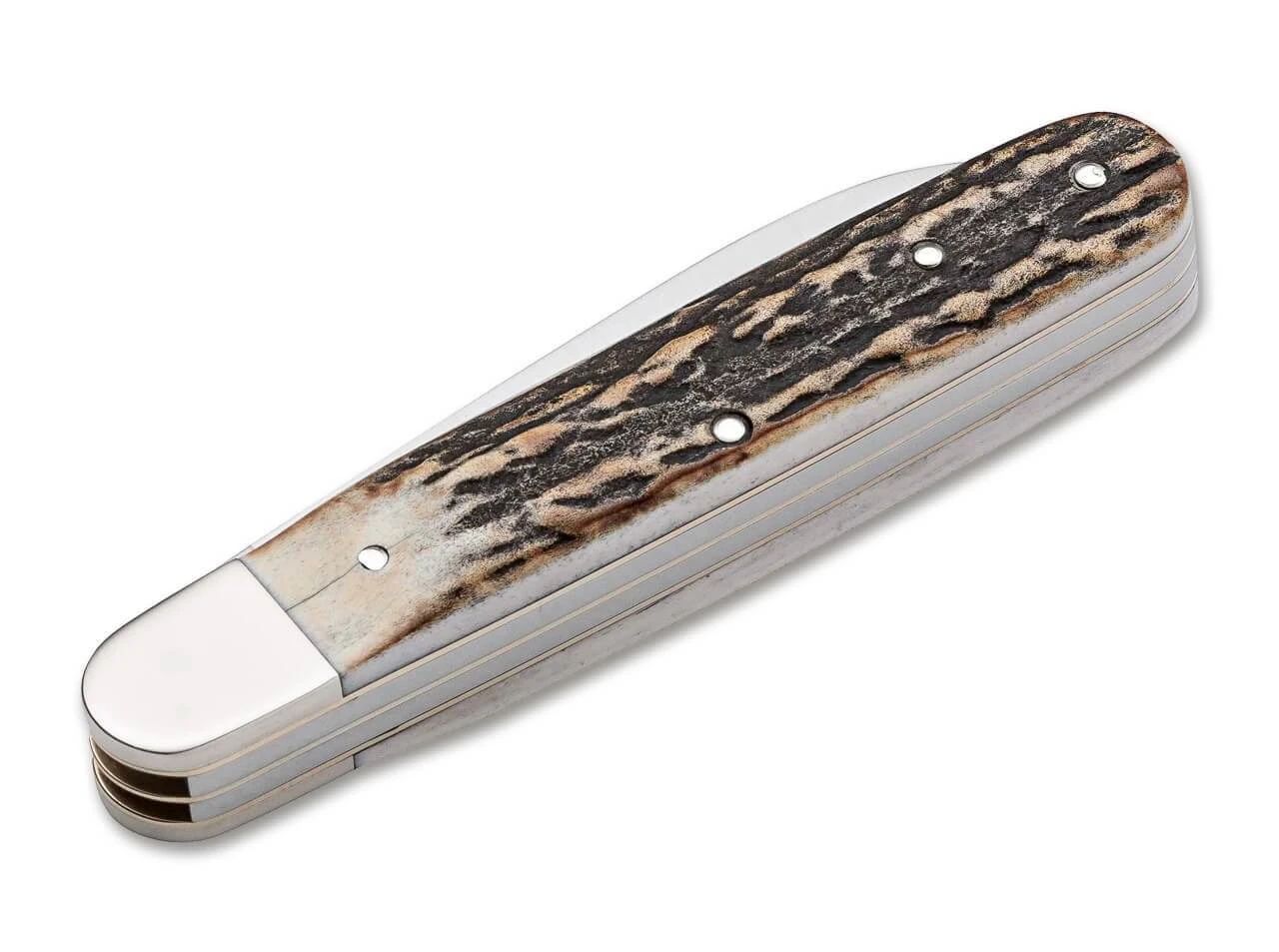 Dieses außergewöhnliche Bauprinzip ist heutzutage kaum noch anzutreffen, weshalb wir uns besonders freuen, diesen Mechanismus für alle Freunde klassischer Messer wieder anbieten zu können. Beide Klingen werden aus 440C gefertigt und fein satiniert. Durch die stabile Bauweise der Hauptklinge mit drei Millimeter Stärke ist das Enigma nicht nur im Alltag, sondern auch jagdlich sehr gut nutzbar. Messingerle und Neusilberbacken betonen den klassischen Auftritt. Mit einer Beschalung aus ausgesuchtem Hirschhorn.