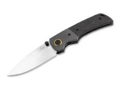 Das moderne Böker Plus Gulo Pro ist nun auch als besonders edle Version verfügbar und überzeugt mit Edelstahl-Backen und Griffschalen aus wilder Kohlefaser. Die kugelgelagerte D2-Klinge mit feinem Satin-Finish wird per demontierbarem Daumenpin geöffnet und von einem stabilen Linerlock gesichert. Entworfen wurde das robuste Taschenmesser von Steve Kelly aus Montana, der bereits seit 2008 Mitglied der amerikanischen Messermacher Gilde ist. Ein messingfarbener Ring um die Klingenachsschraube setzt einen optischen Akzent. Mit Fangriemenöse, abnehmbarem Clip (Tip-up/r) und hochwertigem Nylon-Etui zur Aufbewahrung.