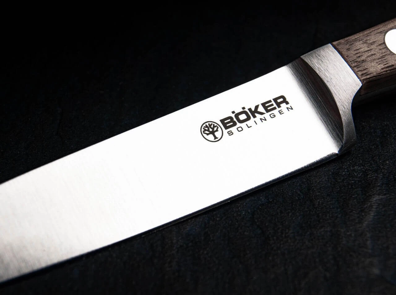 Die geschmiedete Kochmesser-Serie Böker Heritage macht ihrem Namen alle Ehre und tritt das Erbe der traditionellen Solinger Kochmesser an. Das klassische Drei-Nieten-Design wird dafür mit hochwertigen Materialien ausgestattet und führt die perfekte Verarbeitung fort, durch die Solinger Schneidwaren in den letzten Jahrhunderten auf der ganzen Welt bekannt geworden sind. So werden die Klingen der außergewöhnlichen Messer in Vollerl-Bauweise aus X50CrMoV15 gefertigt, der ein ausgewogenes Verhältnis von Schnitthaltigkeit, Rostträgheit und guter Nachschärfbarkeit bietet. Durch die aufwendige Schmiedung in Solinger Handarbeit wird der massive Klingenrohling zusätzlich im Gefüge optimiert, anschließend auf ungefähr 58 HRC gehärtet und zuletzt mit einem feinen Satin-Finish versehen. Die ergonomisch geformten Griffe aus heimischem Walnussholz liegen sehr angenehm in der Hand und vervollständigen das stimmige Gesamtbild. Der geschmiedete Kropf bietet jederzeit einen sicheren Griff, schützt wie der integrierte Knauf vor möglichen Verletzungen und sorgt für eine perfekte Balance.