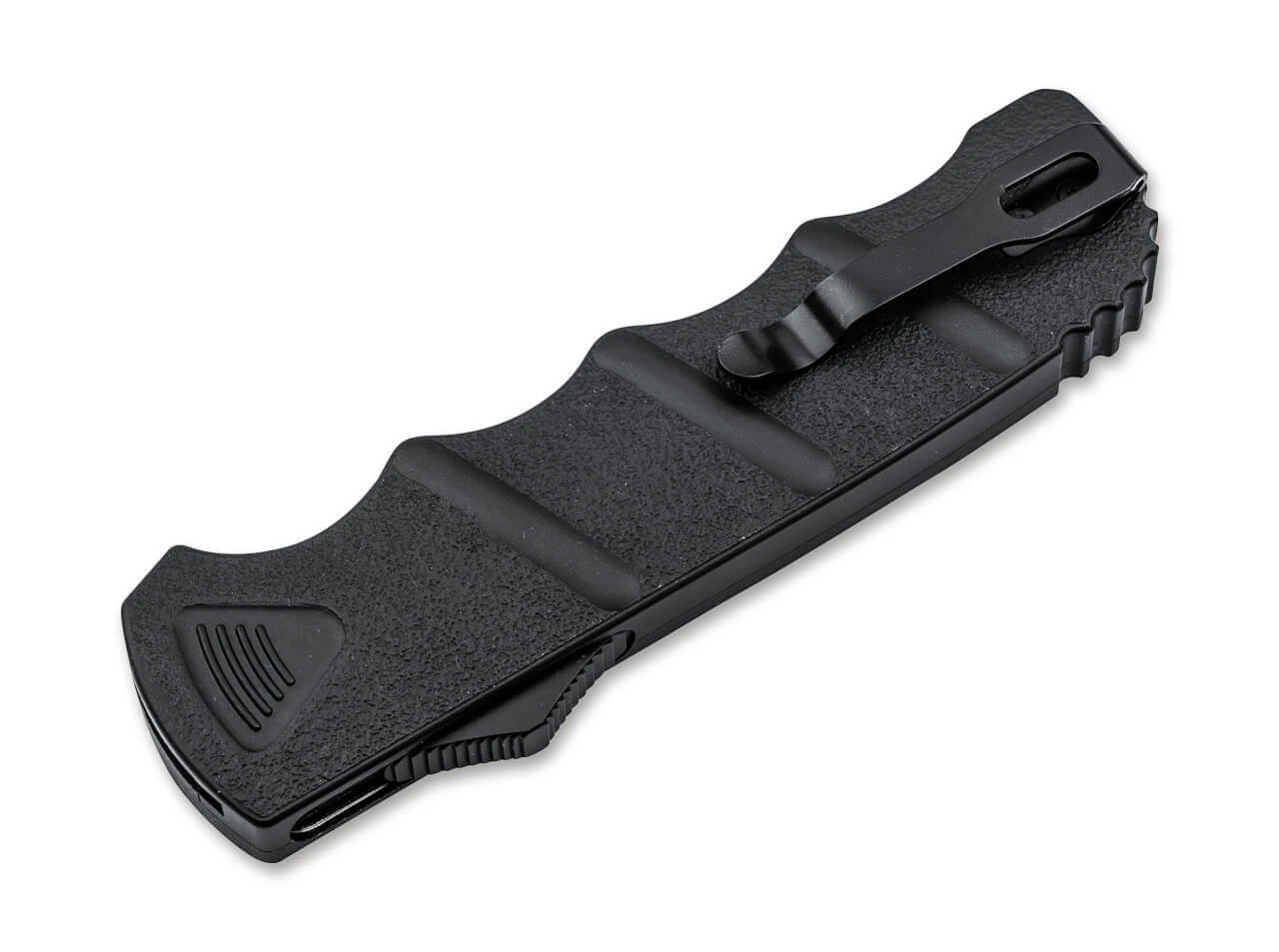 Das robuste Böker Plus Kalashnikov OTF erweitert die beliebte Kalashnikov-Serie um ein modernes OTF. Der schwarze Griff aus Aluminium erinnert stark an das Bajonett des berühmten Sturmgewehrs, die erhabenen Strukturbahnen bieten zudem in jeder Situation sicheren Halt. Die mit einem dunklen Stonewash-Finish versehene Dolch-Klinge wird aus D2 gefertigt und lässt sich bequem über einen Schieber auf dem Griffrücken bedienen. Mit praktischem Deep-Carry-Clip (Tip-down).