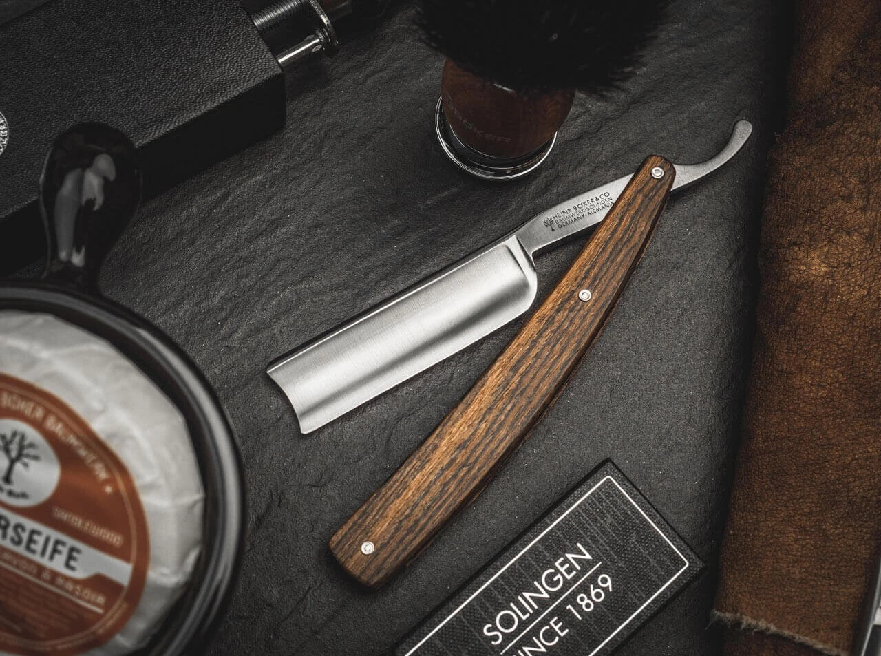 Das mediterrane Böker Locarno LTD mit Spanischem Kopf ist streng limitiert und mit einem fein gemasterten Heft aus edlem Bocoteholz versehen. Die hochwertige Anmutung des Holzheftes wird zudem durch die Verwendung einer dritten Niete unterstrichen. Die 6/8 Zoll breite Klinge dieses außergewöhnlichen Rasiermessers wird extra hohl auf Klang ausgeschliffen und mit einer beidseitigen Serrierung ausgestattet. Mit authentischem Böker Stempel im Klingengang, Echtheitszertifikat und historischer Verpackung. Handgefertigt in der Böker Messer-Manufaktur Solingen.