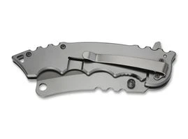 Magnum MortemDie außergewöhnliche Klinge des Magnum Mortem wird aus 440A gefertigt und mittels des Flippers oder des beidseitigen Daumenpins geöffnet. Während die hintere Schale den Framelock trägt, ist die Vorderschale des Edelstahlgriffs mit einem stilisiertem Totenkopf versehen. Die ausgeprägten Riffelungen im Bereich der Daumenauflage garantieren zudem kontrolliertes Schneiden. Mit Clip (Tip-Down) und Fangriemenöse.Technische DatenGesamtlänge: 20,6 cmKlingenlänge: 8 cmKlingenstärke: 2,7 mmGewicht: 197 GrammKlingenmaterial: 440AGriffmaterial: EdelstahlVerschlussart: Framelock