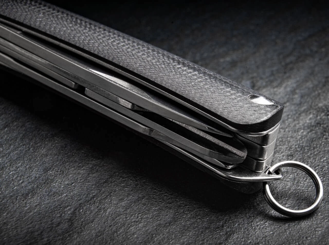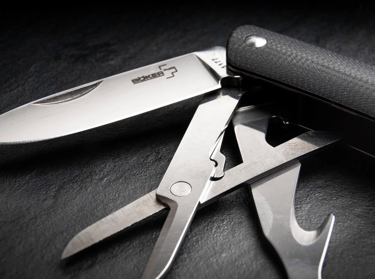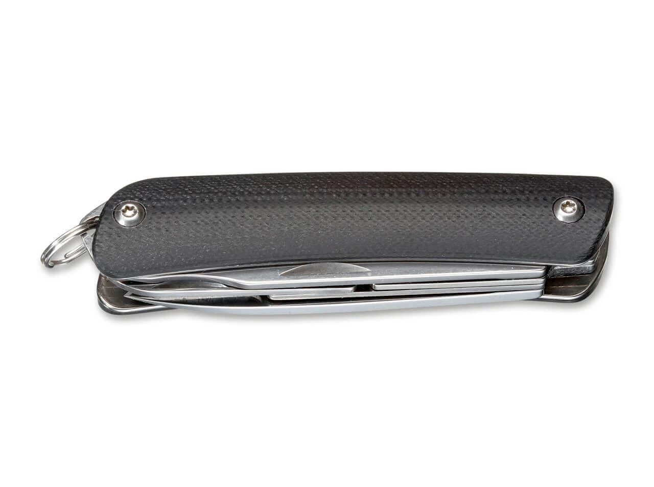 Mit 5,2 Zentimetern Klingenlänge ist das Böker Plus Tech Tool Mini deutlich vielseitiger, alltagstauglicher und effektiver als viele bekannte Schlüsselbundmesser. Es liegt jedoch immer noch absolut innerhalb des Größenbereichs, der auch für den Schlüsselbund prädestiniert ist. Die gleichen hochwertigen Ausstattungsmerkmale wie beim großen Bruder zeichnen auch das Tech Tool Mini aus: Polierte und hohlgeschliffene Klinge aus Sandvik 12C27, konturierte Griffschalen aus schwarzem G10 und ein verschraubter Griff. Eine feste Öse samt Schlüsselring gehört beim Tech Tool Mini zum Standard. Zusätzlich verfügt es über eine Schere und eine Multifunktionsklinge mit Schraubendreher, Gurtschneider und Flaschenöffner.