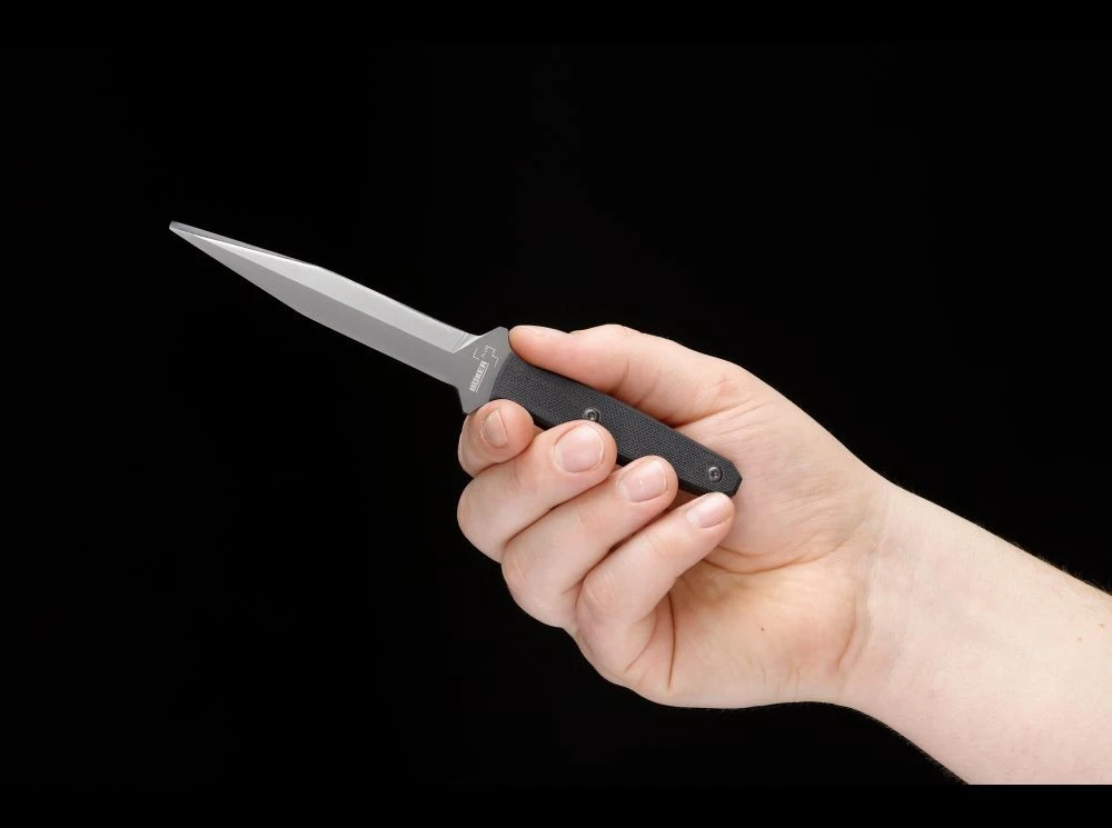 Der kanadische Messermacher Brent Beshara ist bekannt für seinen eigenwilligen Klingenschliff namens Besh-Wedge, der mit seiner bis hin zur Klingenspitze vollen Materialstärke für eine überragende Stabilität der Klinge sorgt. Das Böker Plust Neck Wedge überträgt dieses Konzept in den Bereich der komfortabel zu tragenden Back-up Messer. Als Klingenstahl kommt 440C zum Einsatz, der für eine optimierte Korrosionsbeständigkeit titanbeschichtet wird. Griffiges G10 als Beschalung und eine Kydexscheide komplettieren die Ausstattung und machen das Neck Knife zum professionellen Einsatzwerkzeug.