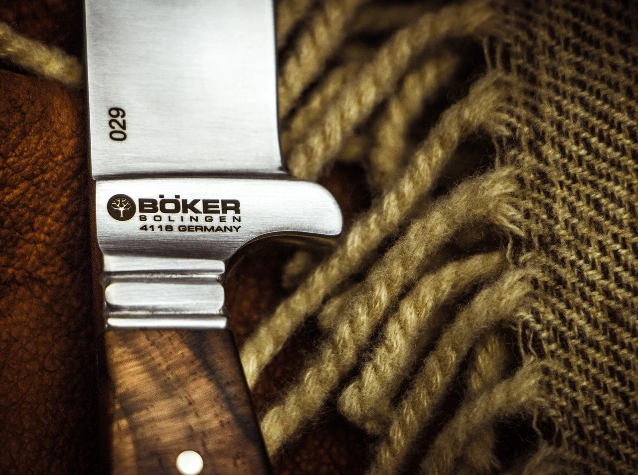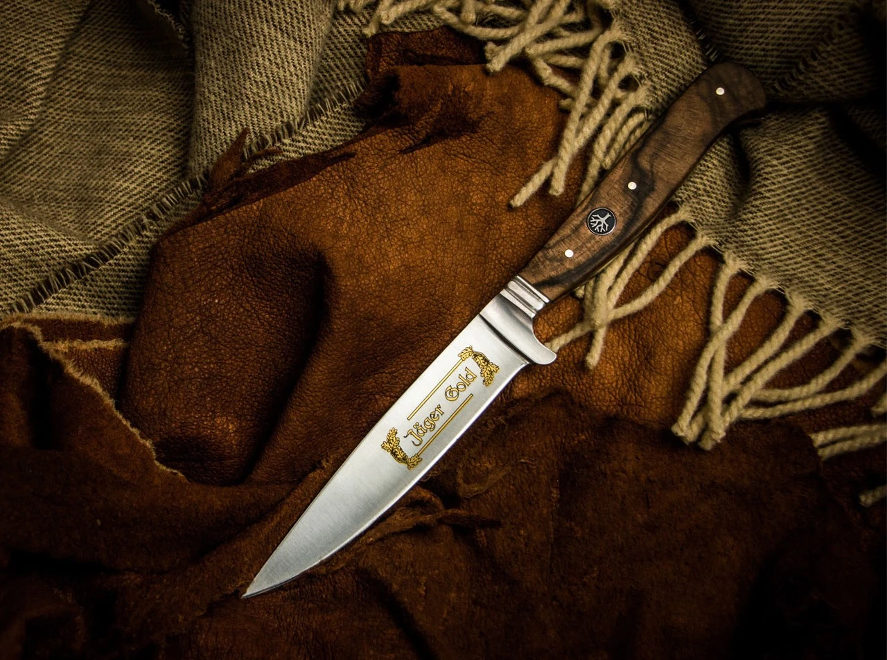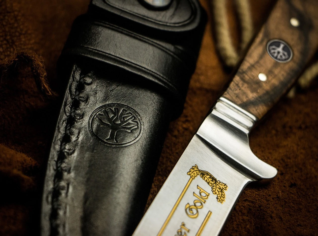 Die echte Goldätzung der Klingen war in den goldenen Zeiten der Solinger Messerindustrie bei hochwertigen Produkten üblich. Mit diesen edlen Eichenlaubranken in Gold unterstreichen wir den exklusiven Anspruch und halten solch klassischen Herstellungstechniken, die heute im Aussterben begriffen sind, die Treue. Das edle heimische Walnuss-Wurzelholz der Beschalung und die gepließteten Klingen strahlen eine zeitlose Eleganz aus.