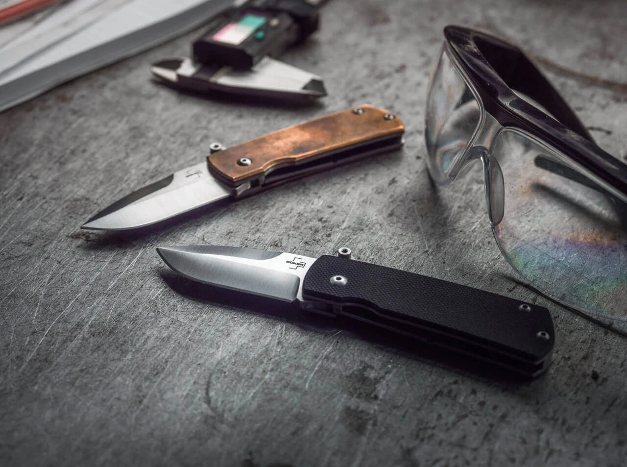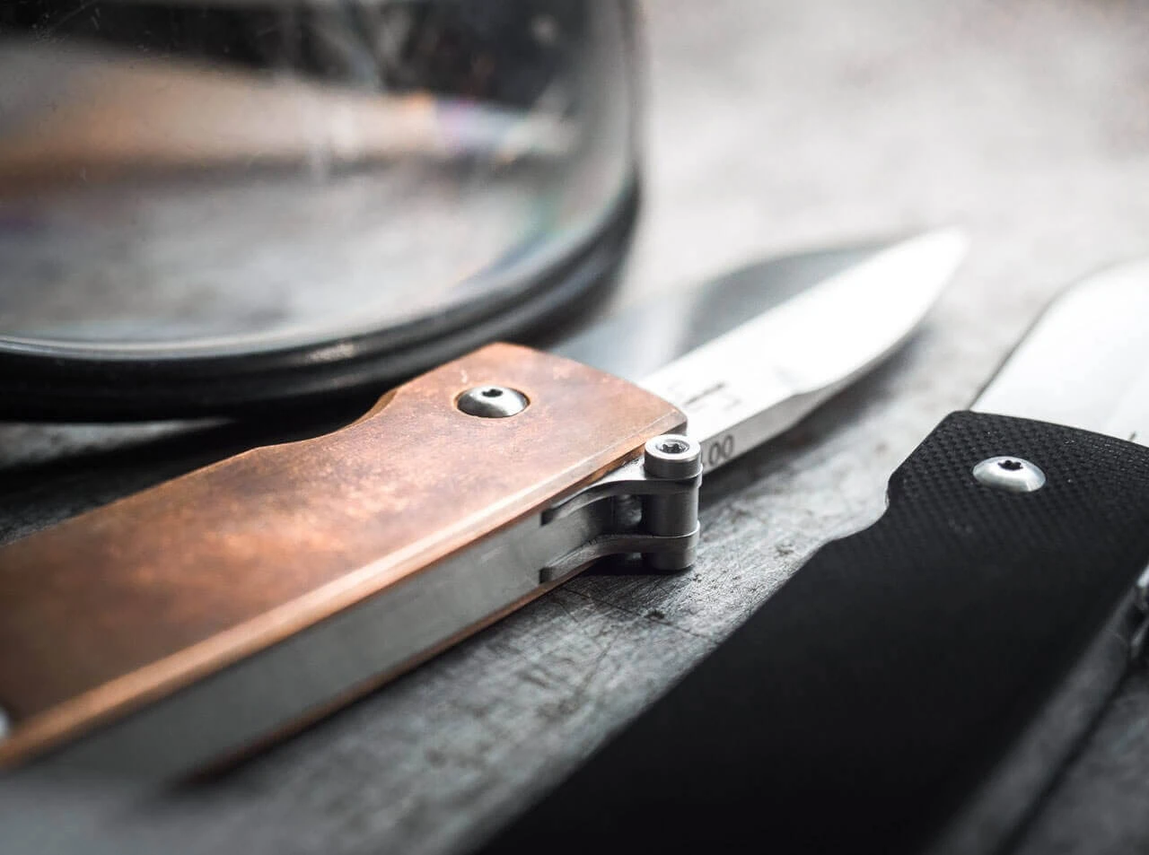 Darriel Caston und Stan Mojzis haben mit dem Böker Plus Shamsher ein minimalistisches Automatikmesser entworfen, das mit einer Gesamtlänge von knapp 12 Zentimetern sicherlich zu den handlichsten Vertretern seiner Art zählt. Die satinierte Klinge aus D2 wird durch das Betätigen des an einen klassischen Flipper erinnernden Auslösers automatisch per Federkraft geöffnet und von einem Linerlock sicher verriegelt. Die eindrucksvollen flachen Griffschalen bestehen aus Kupfer, sodass sich mit der Zeit eine einzigartige Patina auf ihnen bildet. Mit kleiner integrierter Fangriemenöse und hochwertigem Nylon-Etui zur Aufbewahrung.