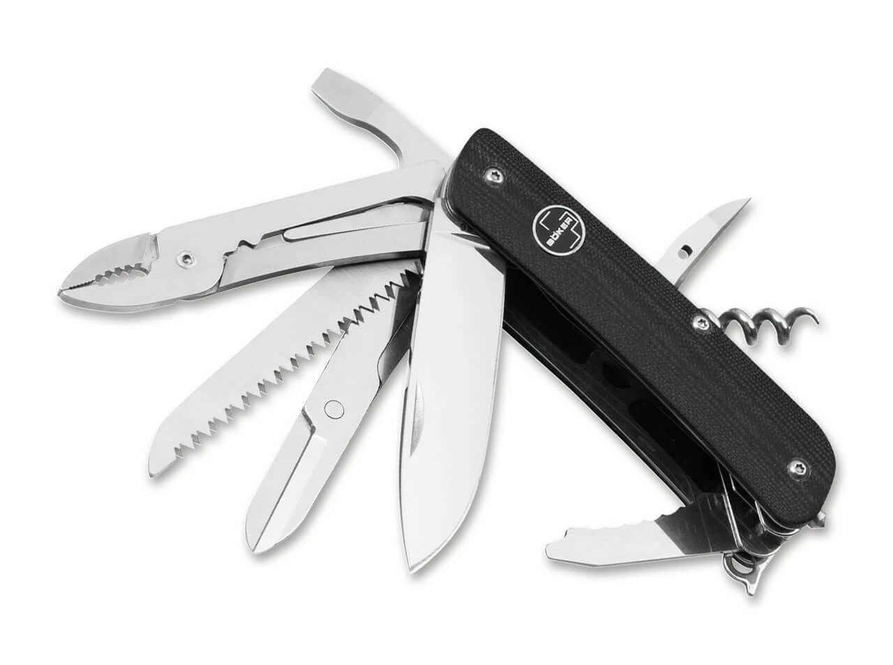 Ausgerüstet mit einer großen Klinge (12C27) und folgenden Werkzeugen (4Cr13): Glasbrecher, großer Schraubendreher mit Flaschenöffner und Drahtbieger/-abisolierer, kleine Wellenschliffklinge mit Schraubendreherspitze, ausklappbare Fangriemenöse, Korkenzieher, Schere, Näh-/Bohrahle, Zange, Holzsäge, Clip. Griffdicke 27mm.